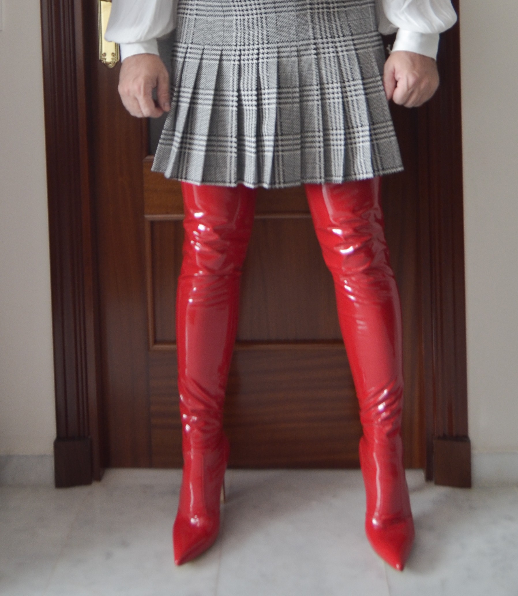 I think this is the winner look. I love the contrast of the red patent thigh boots with the black and white schoolgirl skirt, what an outfit!