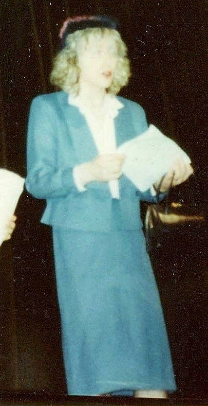 This picture was taken of me on the school stage when I first came out as female. I am wearing a blue skirt suit, high heels white satin blouse, with white satin and lace lingerie, including a full lengths satin and lace slip. Also was fullmade up and perfumed with Chanel No 5.